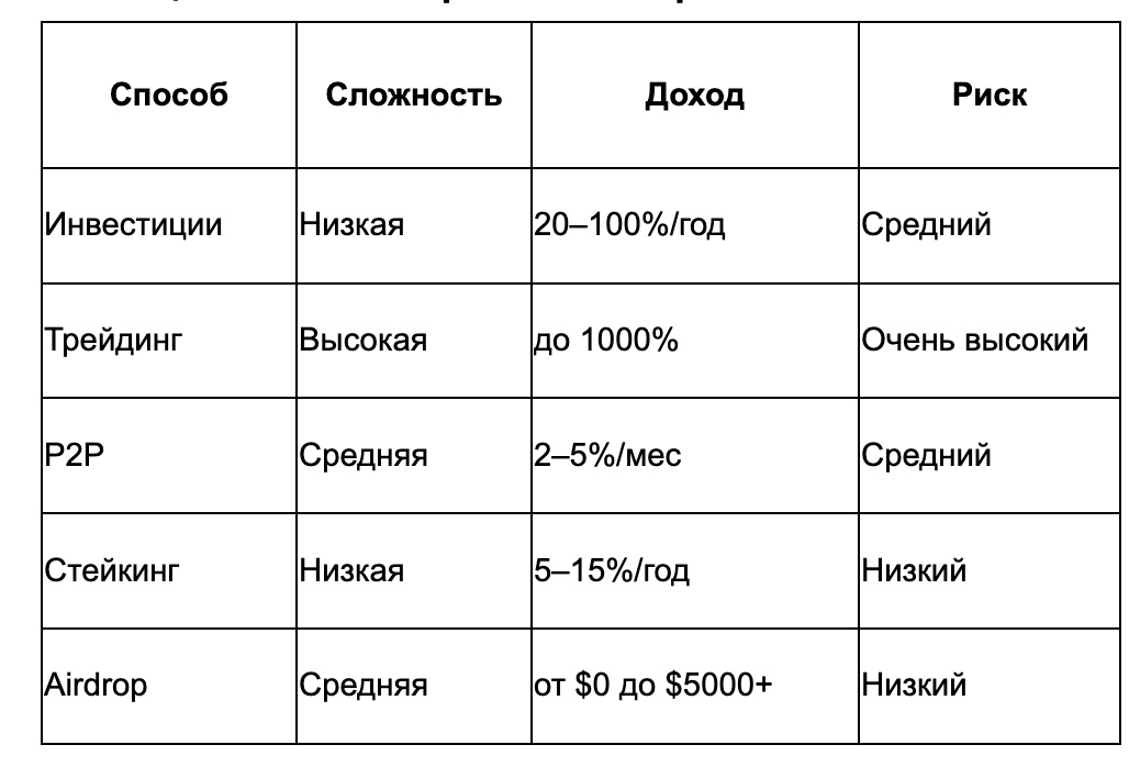 Таблица: способы заработка на криптовалюте